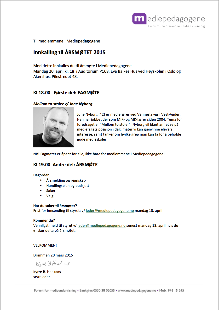 Alle medlemmer i Mediepedagogene er inviterte til årsmøte mandag 20. april. Sted: Auditorium P168, Eva Balkes hus ved Høyskolen i Oslo og Akershus, Pilestredet 48.